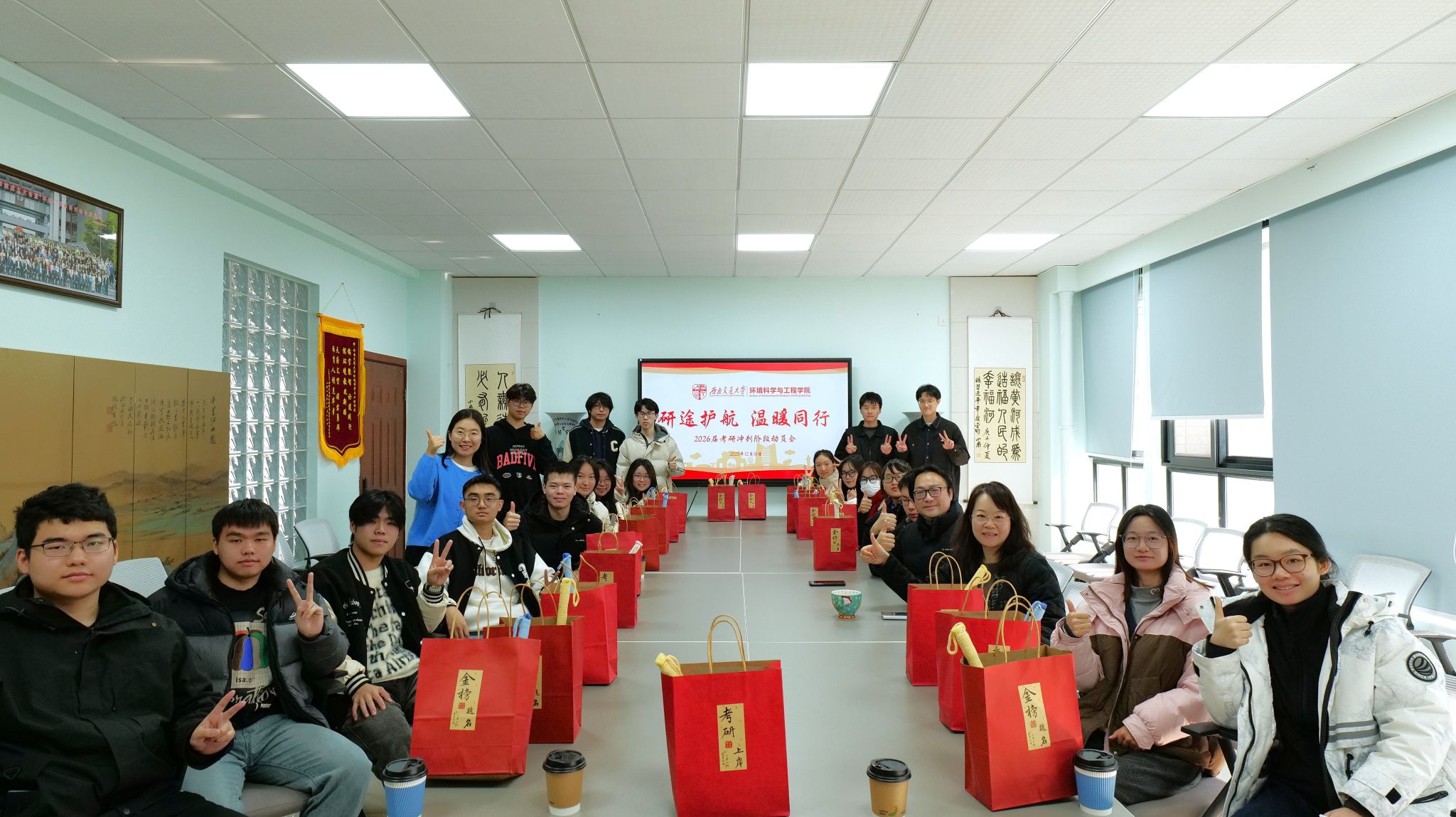 为了对奋战备考的学子们加油鼓劲,在考研冲刺的关键节点,12月10日上午福利社 于X4348教室举行2026届考研慰问暨动员会。学院党委书记甘霖,院长龚正君,本科22级辅导员翟琦,学院学风建设专项负责老师向祎斐,学生会指导老师曾祥珂以及全体2022级考研学生共同参加了本次活动,共话备考初心,共赴冲刺之约。此次活动旨在坚定考研学生的信念,给予他们更多的鼓励和支持,助力学生考研取得优异成绩。活动现场暖意融融,龚老师、...
